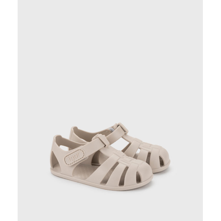 Cangrejera diseñada en concepto barefoot, cero drop, flexible y blandita, fabricada con al menos un 50% de pvc reciclado libre de ftalatos y cierre adherente.